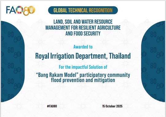 วันที่ 14 ตุลาคม 2568 ที่ผ่านมา โครงการ “บางระกำโมเดล การป้องกันบรรเทาอุทกภัยด้วยการมีส่วนร่วมของชุมชน” (Bang Rakam Model: Participatory Community Flood Prevention and Mitigation) ต้นแบบการบริหารจัดการน้ำโดยชุมชนมีส่วนร่วม ภายใต้การดำเนินงานของ สำนักงานชลประทานที่ 3 กรมชลประทาน ได้รับเกียรติสูงสุดจาก องค์การอาหารและเกษตรแห่งสหประชาชาติ (FAO) คัดเลือกให้เป็นหนึ่งในผลงานทรงคุณค่าด้านการจัดการน้ำอย่างยั่งยืน (Impactful Solution) ในโอกาสเฉลิมฉลองครบรอบ 80 ปีของ FAO