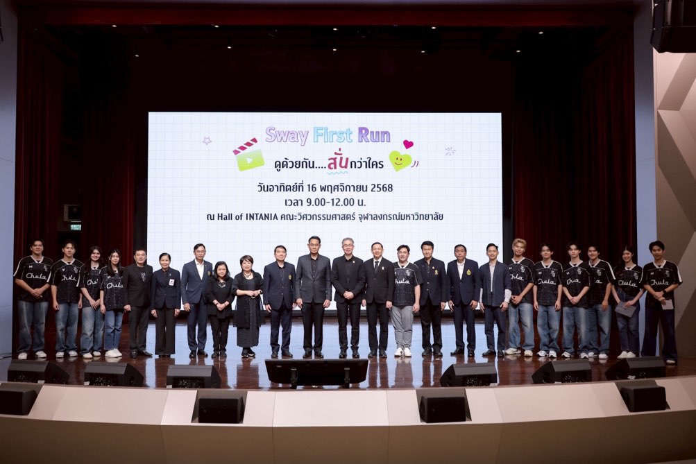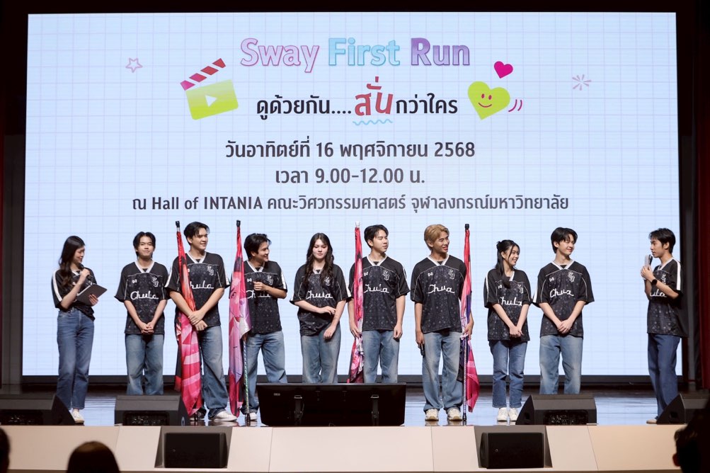สมาคมนิสิตเก่าจุฬาลงกรณ์มหาวิทยาลัยในพระบรมราชูปถัมภ์ (สนจ.) โดย ดร.ณัฐพล รังสิตพล นายกสมาคม เปิด Hall of INTANIA คณะวิศวกรรมศาสตร์ จุฬาลงกรณ์มหาวิทยาลัย จัดงาน “SWAY FIRST RUN ดูด้วยกัน สั่นกว่าใคร” ให้แฟน ๆ กว่า 400 คน ได้ชมซีรีส์แนวใหม่ “SWAY THE SERIES เพราะเธอใช่ไหม…ที่ทำให้ใจฉันสั่น” EP. แรกด้วยกัน โดยเหล่านักแสดงหน้าใหม่ยังได้เสิร์ฟโชว์สุดพิเศษทั้งการแสดงธง Chula Colorguard ใน “เพลงขวัญใจจุฬา” เวอร์ชั่นใหม่ เปิดตัวเพลงประกอบซีรีส์ “เธออีกแล้ว” โดย เคที่ แม็คเอ็นที พร้อมชวนเป็นส่วนหนึ่งของกิจกรรมปิยมหาราชานุสรณ์ ๒๕๖๘ : จุฬาลงกรณ์ แรงบันดาลใจของแผ่นดิน ร่วมบริจาคสมทบทุนจุฬาสงเคราะห์และทุนอาหารกลางวันและสนับสนุนกิจกรรมเพื่อสังคมของ สนจ. ต่อไป