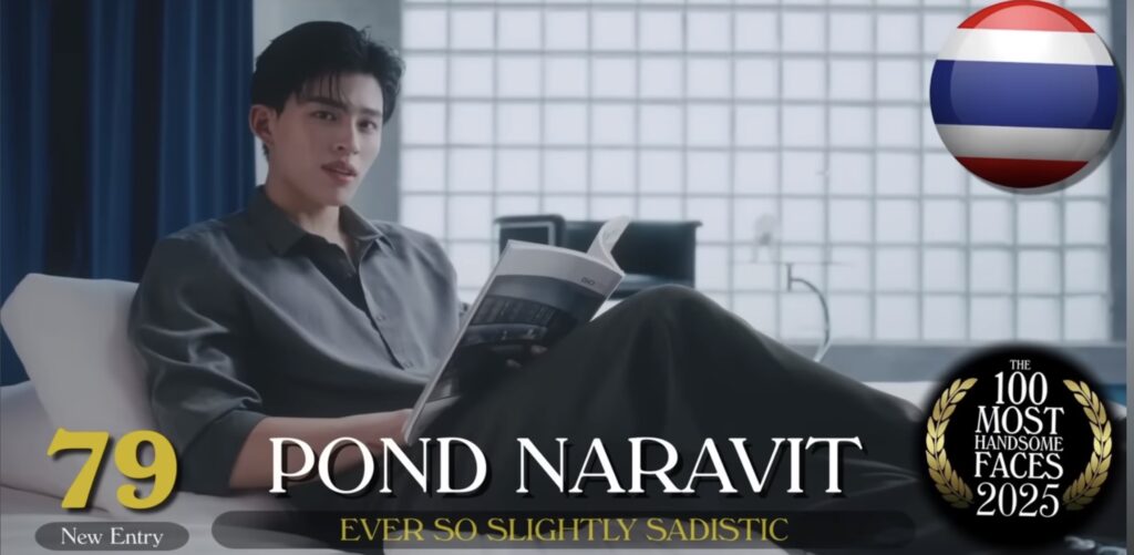 ”ปอนด์ ณราวิชญ์“ คว้าอันดับที่ 79 ไปครอง เป็นอีกหนึ่งหนุ่มที่น่าจับตามองเป็นอย่างมาก ออร่าความหล่อของเขามาแรงมากในปี 2025 เขามัก Surprise แฟนๆด้วยฝีมือการแสดงที่พัฒนาขึ้นอย่างก้าวกระโดดในทุกๆผลงานที่ปล่อยออกมา และในนาทีนี้ไม่มีใครไม่รู้จักเขาในบทบาท ”ธีรกิต เคียน ลี“ หรือคุณธีร์ จากซีรีส์มาแรงที่สุดจากGMMTVตอนนี้ มีสติหน่อยคุณธีร์ (ME AND THEE) ที่เป็นไวรัลทั่วบ้านทั่วเมืองกับประโยค ราตรีสวัสดิ์นะคนดื้อ!!