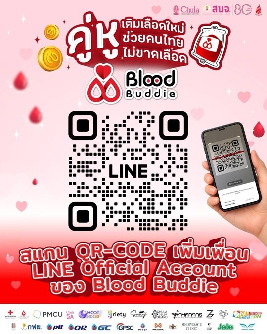 Blood Buddie “ยิ่งแมตช์ ยิ่งได้ ด้วยกัน” เป็นต้นแบบของการออกแบบแพลตฟอร์มให้เป็น คอมมูนิตี้เพื่อสังคมยุคใหม่ ที่ไม่ว่าคุณจะอยู่ในบทบาทใด ก็มีส่วนร่วมเป็น “คู่หูเติมเลือดใหม่ ช่วยคนไทยไม่ขาดเลือด” ให้ระบบโลหิตของประเทศได้แล้วตั้งแต่วันนี้ เข้าร่วมง่าย ๆ เพียงสแกน QR Code หรือแอดเฟรนด์ LINE Official Account “Blood Buddie” หรือคลิกที่ลิงค์นี้ https://line.me/R/ti/p/@569ggyqn และติดตามรับชม Sway The Series ตอนพิเศษ “Blood Buddie แมตช์นี้…เพื่อเธอ” ได้ทาง Youtube Channel “Chula Alumni” ตั้งแต่วันนี้เป็นต้นไป