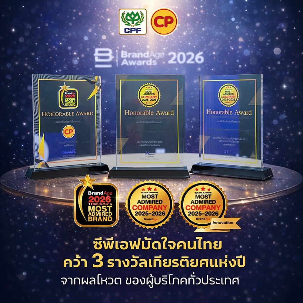 จากความมุ่งมั่นในการพัฒนานวัตกรรมอาหารที่มีคุณค่าทางโภชนาการ เพื่อสุขภาพที่ดีและโลกที่ยั่งยืน บริษัท เจริญโภคภัณฑ์อาหาร จำกัด (มหาชน) หรือซีพีเอฟ ได้รับ 3 รางวัลจากเวที BrandAge Awards ครอบคลุมทั้งระดับองค์กรและแบรนด์ ได้แก่ 2025–2026 Thailand’s Most Admired Company องค์กรที่มีความน่าเชื่อถือสูงสุด อันดับ 1 กลุ่มธุรกิจอาหารพร้อมทาน และมีความโดดเด่นด้านนวัตกรรมในกลุ่มธุรกิจอาหาร พร้อมกันนี้ยังได้รับรางวัล 2026 Thailand’s Most Admired Brand หมวดผลิตภัณฑ์ไส้กรอกซีพี ต่อเนื่องเป็นปีที่ 4 โดยรางวัลดังกล่าวอ้างอิงจากผลสำรวจความคิดเห็นของผู้บริโภคทั่วประเทศ