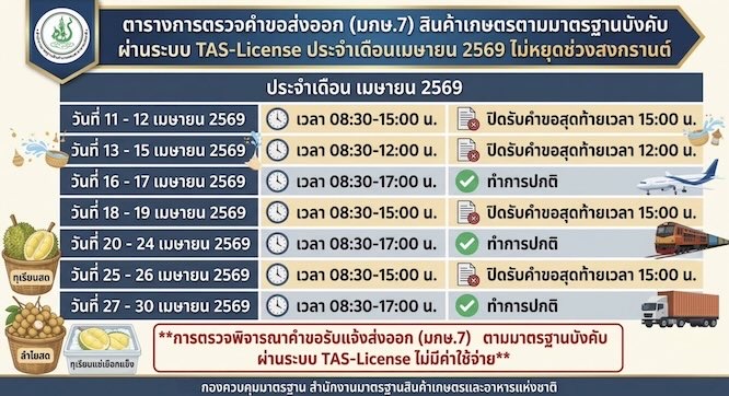 สำนักงานมาตรฐานสินค้าเกษตรและอาหารแห่งชาติ (มกอช.) โดยกองควบคุมมาตรฐาน แจ้งตารางการให้บริการตรวจพิจารณาคำขอรับแจ้งส่งออกสินค้าเกษตรตามมาตรฐานบังคับ (มกษ.7) ผ่านระบบ TAS-License ประจำเดือนเมษายน 2569 ซึ่งยังคงเปิดให้บริการอย่างต่อเนื่องในช่วงเทศกาลสงกรานต์ เพื่ออำนวยความสะดวกแก่ผู้ประกอบการส่งออกสินค้าเกษตร